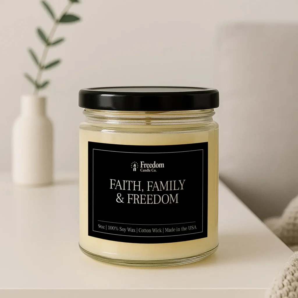 Faith, Family & Freedom evokes open skies, rolling fields, and the pride of home. Poured in a clear glass jar and finished with our signature label, this candle is a tribute to tradition, heritage, and the enduring beauty of America.